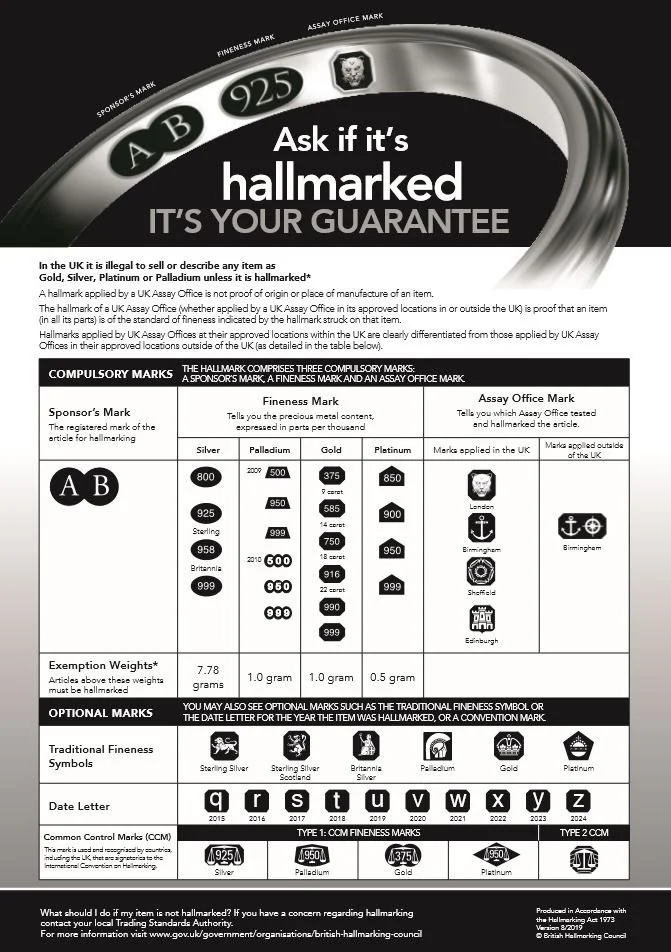 The term Hallmarking describes the practice of stamping or ‘marking’ a piece of precious metal so the owner or purchaser knows what a piece of jewellery or metal ware is made of. This mark gives a piece of work authenticity. British Hallmarking regulations are quite stringent, meaning that if one wishes to sell a piece of jewellery or something made of precious metal it must bear a hallmark.